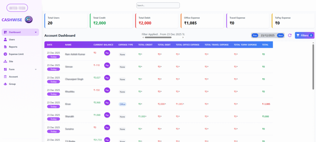 Access real-time dashboards showing balances, credits, debits, and overall cash movement. Both admins and employees have clear visibility into their financial status.