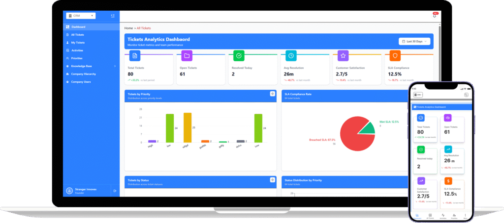 Stay updated with instant notifications and a central dashboard showing open tickets, SLA status, and team performance.